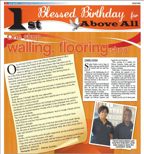 One year ago I paid a visit to the Pelican Zululand branch office after closing the branch at the end of December 2009. My reason was to meet with businessmen who had shown an interest in taking over the business and becoming a Class A distributor of the Pelican and Lafarge Gypsum product range in Zululand. Sasha Naidoo, at that stage, was acting as caretaker after having been retrenched, owing to our decision to close the branch. I was so impressed by her work ethic that my plan was to recommend her as the manager of any new business that was formed by any of the businessmen that I had earmarked. Sasha had obviously done her homework and when I visited she surprised me by asking me why I had not thought of giving her the opportunity to run the business. To be honest, I thought that this was impossible. Well, the rest is history and 12 months have passed since we agreed to give her the chance to prove herself. I am proud to recommend Above All Ceilings and Partitions as our exclusive distributor to the sub-contractors and builders in the Zululand area, and in particular this special business woman who is a single mother with two children who are students. The results she has achieved are extraordinary and in a tough climate she has made payment every month. All at Pelican wish her well and know that her business will grow from strength to strength.