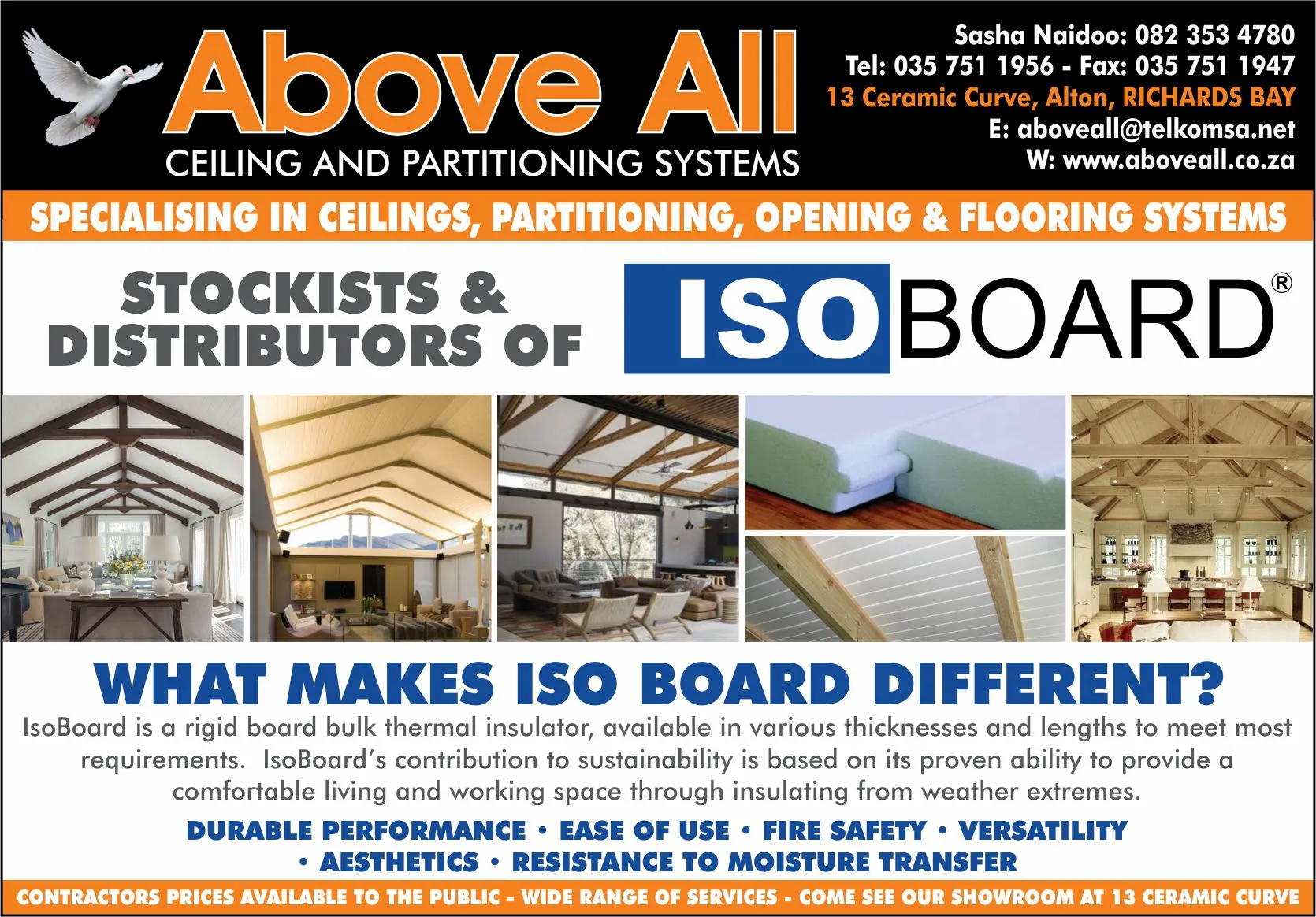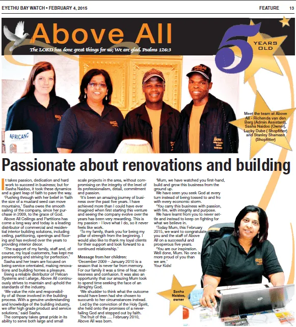 Sasha Naidoo took a leap of faith a year ago and her belief in herself and her staff has paid off. Taking on the challenging job of running her own business has paid dividends and Above All Ceilings and Partitions has grown into a thriving business in the home improvement sector. Sasha and her loyal and dedicated staff strive for perfection in all that they do and this shows in the increased business they have received in the last 12 months. Above All Partitions and Ceilings came into existence when Sasha bought out Pelican Systems and began her own business. Now, serving as a retailer for Pelican Systems, Sasha and her team make renovating and building homes a pleasure. Sasha says, ‘I could not have done this without the support of my excellent staff and loyal customers. ‘I would like to especially thank my children, Judy and Neven who, although not directly involved in the business, have provided support and assistance whenever needed. ‘An extra special thanks to my customers. It has been an honour and a pleasure to meet your needs and we look forward to a continued and improving relationship over the coming years.